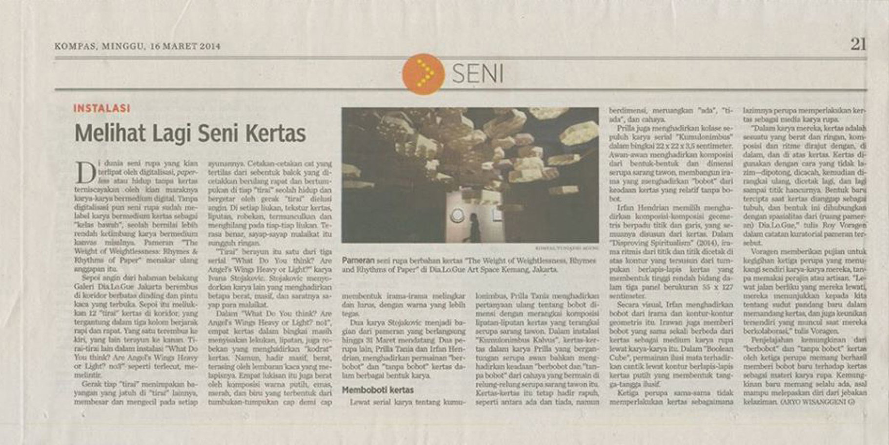 These two works by Stojaković are part of the exhibition that lasts until March 31. Two more artists, Prila Tania and Irfan Hendrian, explore the "weight" and "weightlessness" of paper in different forms of work.....Three artists did not treat paper the way we usually treat paper as a medium for visual works. "In their work paper is both heavy and light, composition and rhythm are woven on and in the paper. Paper is used in unconventional ways - cut, shredded, then reassembled, printed and reprinted to the point of disintegration. The paper becomes the flesh from which they are shaped new forms, which immerse themselves in the space of the "Dia.Lo.Gue" gallery, wrote Roy Voragen in the curatorial notes of the exhibition. Voragen praised the persistence of the three artists who created their works themselves, without mastered craftsmanship and technical aids. "Through the winding road which they embarked on, showed us new perspectives on looking at paper, as well as the uniqueness that emerged when they collaborated," writes Voragen.