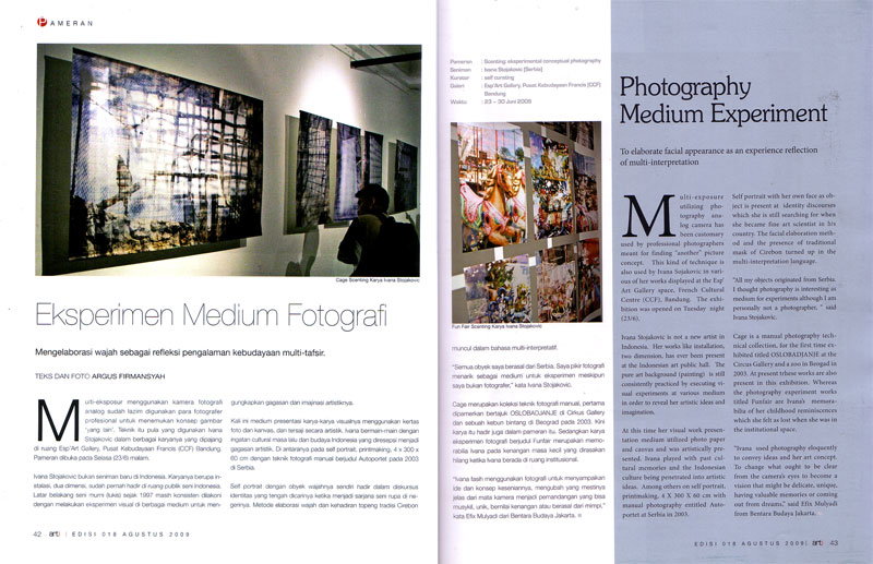 A self-portrait with one's own face as an object is present in discourses about identity, which Ivana has been searching for since her first artistic steps in her country. Accumulation of one's own face using the method of multiple exposure and the presence of a traditional Cirebon mask form a visual language with multiple possibilities of interpretation. "All the motifs in the photographs come from Serbia, where the photographs were taken, but in Indonesia they are recognized as already existing and not as motifs from my imagination." For these reasons, a series of photographs taken in 2003 in Serbia was elaborated and introduced now, in 2009, in Indonesia. I found photography interesting as a medium for experiments, even though I'm not a photographer myself," said Ivana Stojaković.